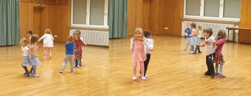Ob zu flotten Rhythmen wie Knall bum Knall, dem singende und springende Känguru, traditionellem, wie der Herbst, der Herbst der Herbst ist da, oder zu aktuellen Hits der Kinder wie zum Beispiel der Weihnachtsbäckerei oder Schnappi. Zu allem kann man mit einfachen Bewegungen , die schon unsere kleinsten mit 3 Jahren ausführen können mit Begeisterung tanzen. Außerdem wird durch die Vielseitigkeit der Tänze auch die Merkfähigkeit der Kinder geschult.